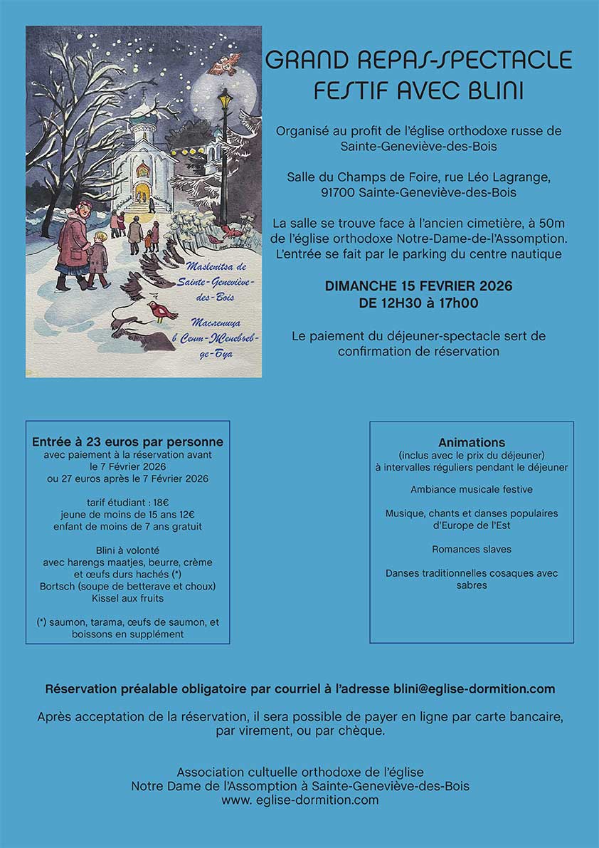 Réservation préalable obligatoire par courriel à l'adresse blini@eglise-dormition.com ou par téléphone au secrétariat de l'église au 09 52 98 82 01.